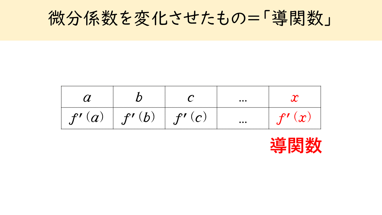 数の代わりにxを入れることで関数になります。この関数を「導関数」といいます。